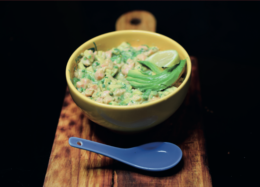 salmón en trozos, palta, cibullet y limón